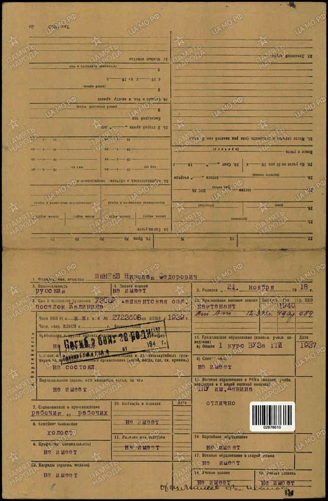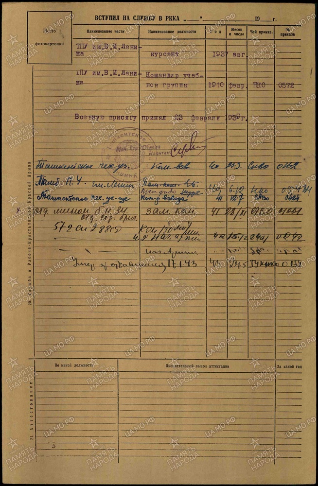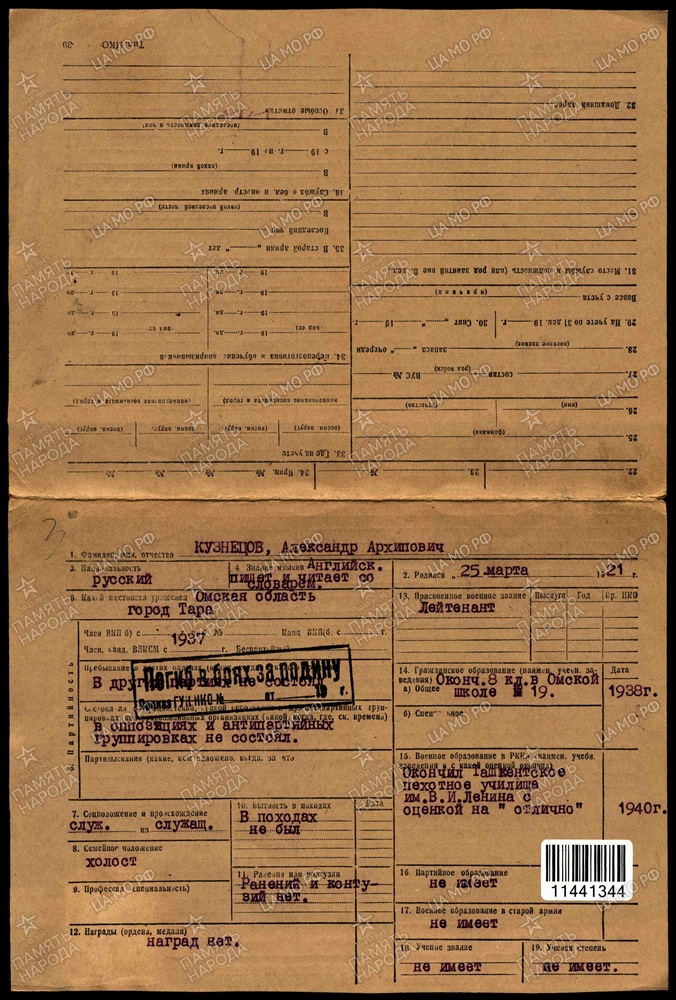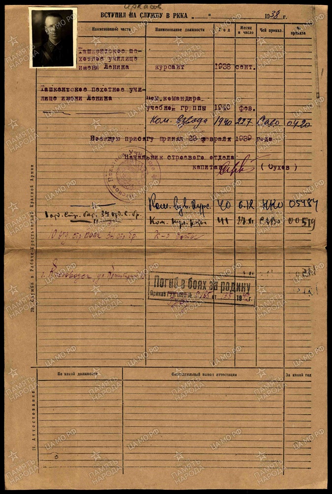 Выпускник 1940 года Ташкентского Краснознаменного пехотного училища имени В.И. Ленина (Приказ НКО СССР № 0572 от 11 февраля 1940 года).