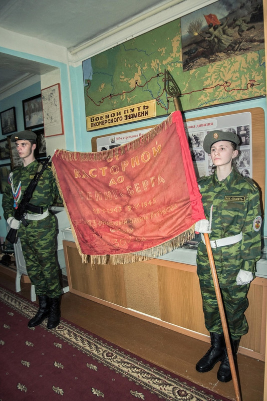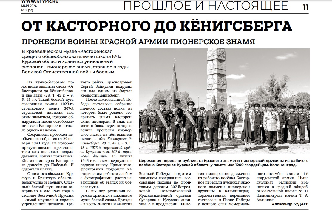 Брянский музей получил копию Боевого пионерского знамени.В музее боевой славы касторенской средней школы № 1 хранится уникальный экспонат – пионерское знамя, ставшее в годы Великой Отечественной войны боевым. На тёмно-багровом полотнище золотыми буквами вышиты слова «От Касторного до Кёнигсберга» и две даты «28.1.43 г. – 9.5.45 г.». Такой героический путь совершили воины 1023-го стрелкового полка 307-й стрелковой дивизии 13-й армии под этим знаменем, которое обнаружили после освобождения города Касторного в подвале одного из домов.
