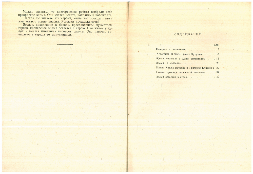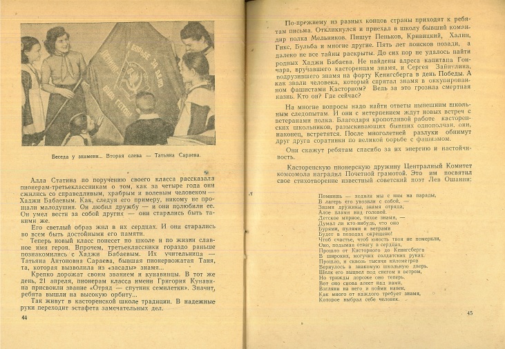 11 августа 1945 года знамя вернулось в родную школу. Кроме того, фронтовики подарили касторенским ребятам альбом с фотографиями, рассказывающими об этапах их боевого пути.