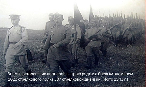А вот другое пионерское знамя вдохновляло на подвиги бойцов 1023-го стрелкового полка 307-й стрелковой дивизии 13-й армии. Его нашли в посёлке Касторном в ходе Воронежско-Касторенской наступательной операции. Эта операция стала заключительным аккордом в цепи успешных сражений, завершившихся разгромом немецко-фашистских войск на Среднем и Верхнем Дону (операции «Малый Сатурн» и Острогожско-Россошанская). За 25 дней наступления с 24 января по 17 февраля 1943 года войска правого крыла и центра Воронежского и левого крыла Брянского фронтов полностью освободили город Воронеж, Воронежскую и значительную территорию Курской областей. Была уничтожена крупная группировка войск противника, что создало благоприятные условия для последующего проведения Харьковской операции и удара на Курском направлении.