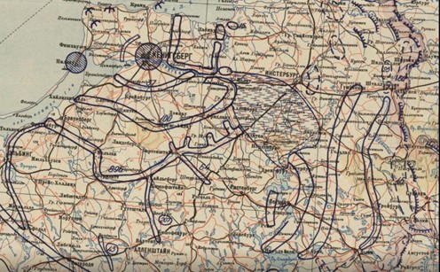 ….Во всём районе идёт лихорадочная перегруппировка войск, с запада к фронту непрерывно подвозят резервы. На западном берегу реки Алле, от Велау до Алленбурга, строятся новые и совершенствуются старые оборонительные рубежи.