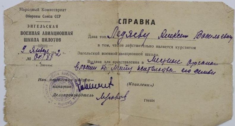 Справка Ледяеву А. В. в том, что он является курсантом Энгельсской авиационной школы пилотов