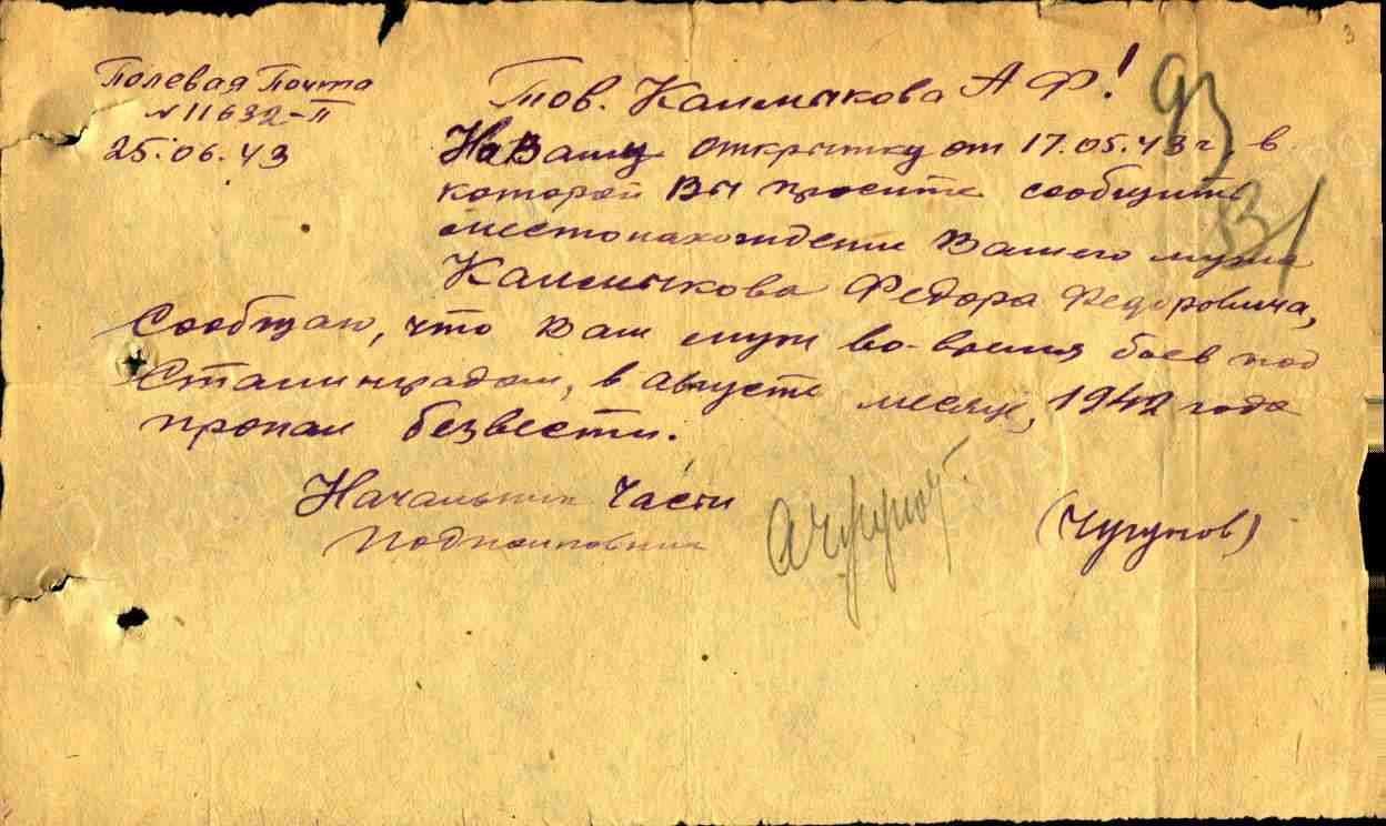 Сталинградская обл., г. Сталинград, около https://pamyat-naroda.ru/heroes/memorial-chelovek_dopolnitelnoe_donesenie71691604/?backurl=%2Fheroes%2F%3Fgroup%3Dall%26types%3Dpamyat_commander%3Anagrady_nagrad_doc%3Anagrady_uchet_kartoteka%3Anagrady_ubilein_kartoteka%3Apdv_kart_in%3Apdv_kart_in_inostranec%3Apamyat_voenkomat%3Apotery_vpp%3Apamyat_zsp_parts%3Akld_ran%3Akld_bolezn%3Akld_polit%3Akld_upk%3Akld_vmf%3Akld_partizan%3Apotery_doneseniya_o_poteryah%3Apotery_gospitali%3Apotery_utochenie_poter%3Apotery_spiski_zahoroneniy%3Apotery_voennoplen%3Apotery_iskluchenie_iz_spiskov%3Apotery_kartoteki%3Apotery_rvk_extra%3Apotery_isp_extra%3Asame_doroga%3Asame_rvk%3Asame_guk%3Apotery_knigi_pamyati%26page%3D1%26grouppersons%3D1%26last_name%3D%D0%9A%D0%B0%D0%BB%D0%BC%D1%8B%D0%BA%D0%BE%D0%B2%26first_name%3D%D0%A4%D0%B5%D0%B4%D0%BE%D1%80%26middle_name%3D%D0%A4%D0%B5%D0%B4%D0%BE%D1%80%D0%BE%D0%B2%D0%B8%D1%87%26data_i_mesto_priziva%3D%D0%93%D1%80%D0%BE%D0%B7%D0%BD%D0%B5%D0%BD%D1%81%D0%BA%D0%B8%D0%B9&Ответ на запрос из штатба 184-й сд