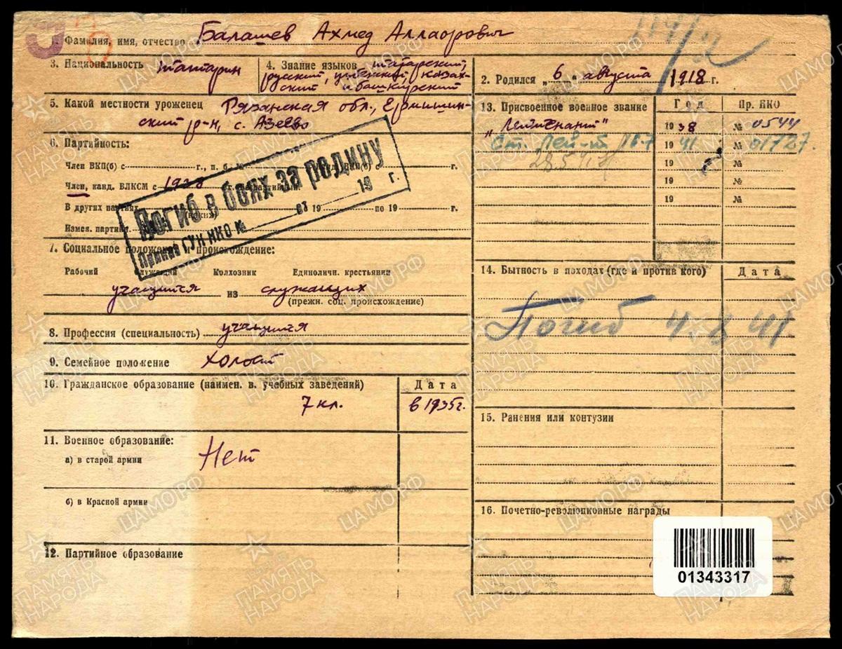 Причина выбытия пропал без вести Дата выбытия 15.09.1941