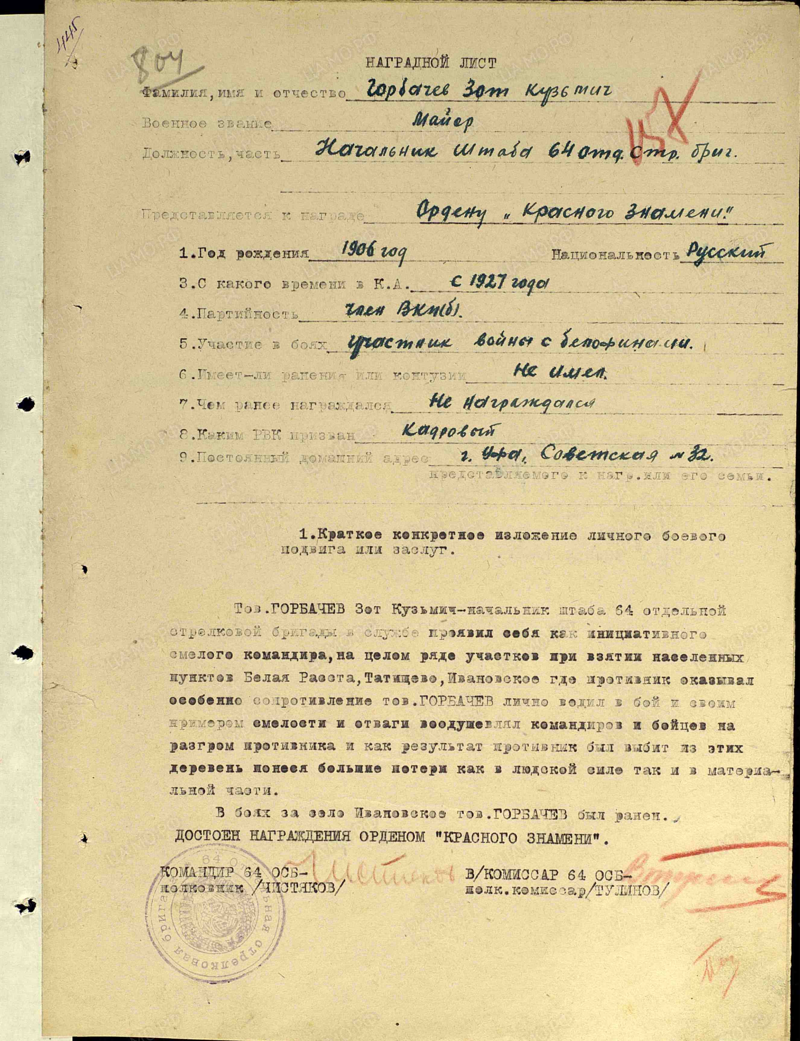 - Сведения по награждениям воинов 64-й осбр (1941-1942)