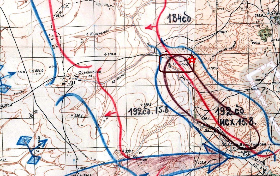 16 августа ожесточенные бои продолжались. Штаб дивизии оставался на месте в Верхне-Голубой, окруженный гитлеровцами. Комдив полковник К. А. Журавлев был тяжело ранен; его вынесли из окружения и спасли. Командование дивизией принял начальник политотдела Серебрянников, но он вскоре погиб. 17 августа немцы окружили командный пункт 753-го стрелкового полка. Работники штаба вступили в бой. Гитлеровцы забросали КП гранатами и перебили охрану. В этом бою погибли командир полка майор А. И. Волков и начальник штаба капитан А. И. Запорожцев. http://rkkawwii.ru/division/192sdf2Хутор Голубая-хутор Голубинский 2-й, Голубинское сельское поселение, Калачёвский район, Волгоградская областьhttps://yandex.ru/maps/geo/khutor_golubinskiy_2_y/53165263/?ll=43.492092%2C49.081319&z=15