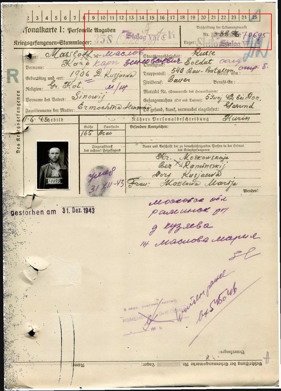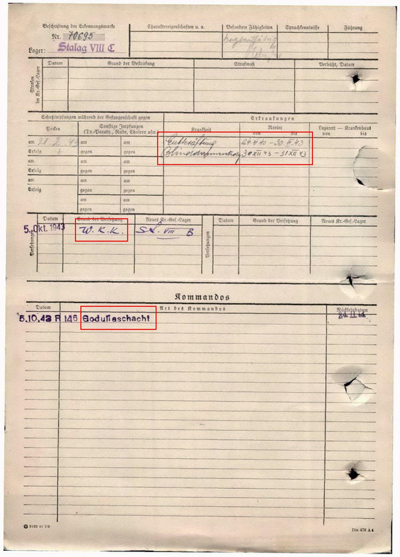 Уважаемые коллеги! Прошу помочь с картой пленного. В "шапке" штампы, наложенные один на другой, записи от руки, номер пленного изменен. Может ее вообще начали на одного заполнять, а закончили на другого? С обратной стороны в графе перемещений сокращение W.K.K., не знаю что это. И, если не трудно, что-то о диагнозах и рабочей команде. Спасибо