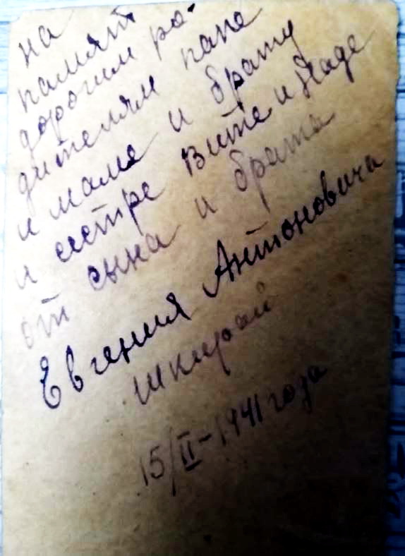 Запись на обороте фото: «Напамять дорогим родителям папе маме и брату и сестре Вите и Наде от сына и брата Евгения Антоновича Шкирай. 15/II-1941 года»: