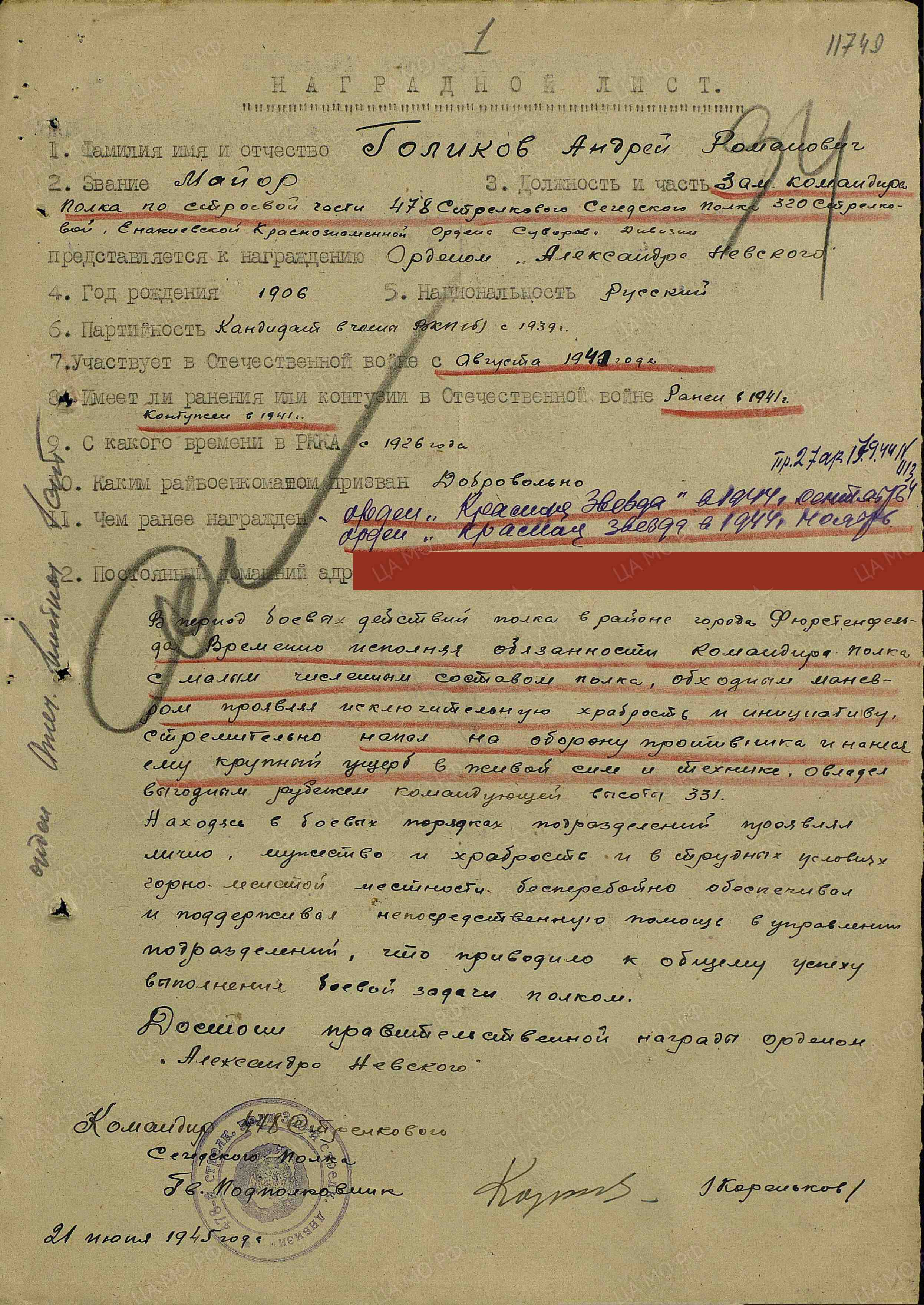 - медалью «За победу над Германией в Великой Отечественной войне 1941–1945 гг.» (09.05.1945);